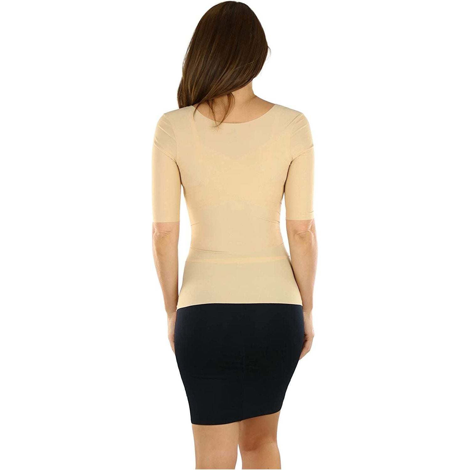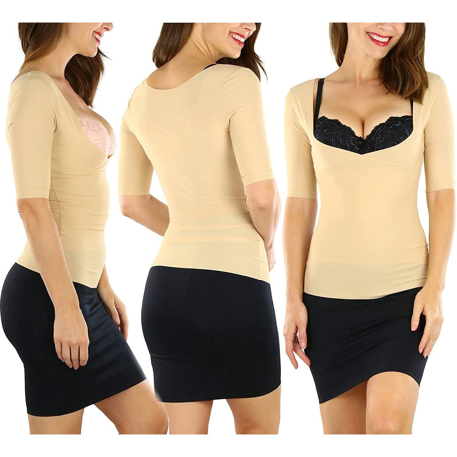 - 💕 Tone and reshape your arms with these compression arm shapers! These arm shapers help tighten and firm loose skin on arms, creating a slimmer and more toned look underneath those fitted dresses and tops you love to wear. The criss-cross bands in the front of the tops help to improve and maintain back posture as well as lifting and supporting the chest. With a variety of styles and colors to choose from, you're sure to find the perfect shaper top to go with your style!